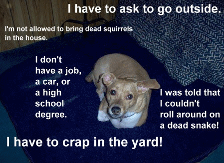Meanwhile, everybody seems to think he deserves special consideration. The ugly person thinks there is too much importance placed on looks. The feminist thinks a starting teacher should make as much as a starting coal miner because more women are interested in teaching. The black guy thinks he should be given reparations because of slavery. The Hispanic guy thinks his crime of crossing into the country illegally should be ignored because he has been here a long time. The wealthy business owner thinks his taxes should be less because he is providing jobs for other people. Even the dogs have problems.