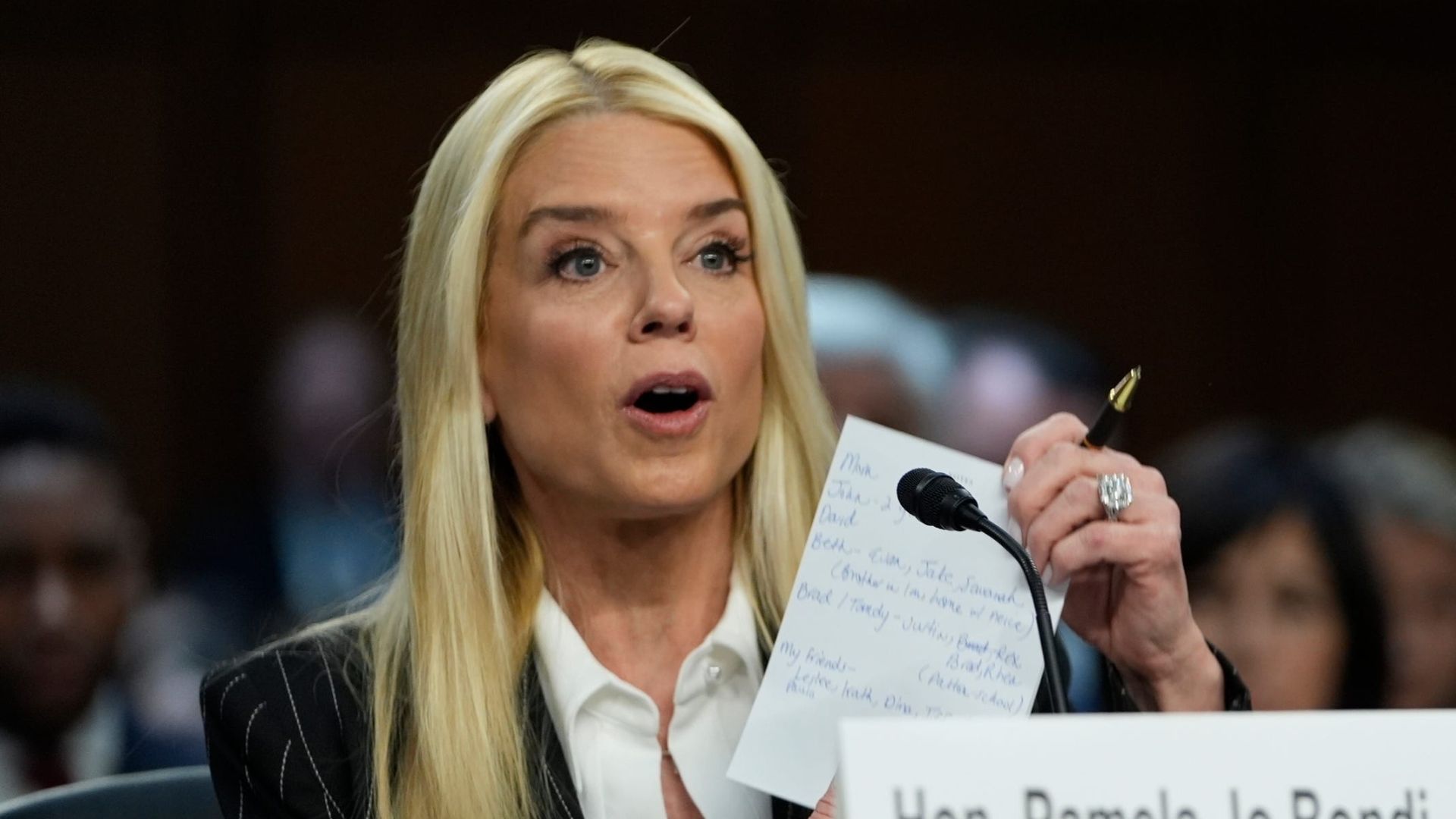 Pam Bondi recognizes family and friends in attendance as she delivers opening remarks during a Senate Judiciary committee hearing on her nomination to be Attorney General of the United States on Jan. 15, 2025 in Washington, D.C.