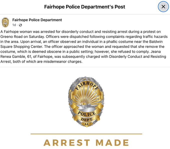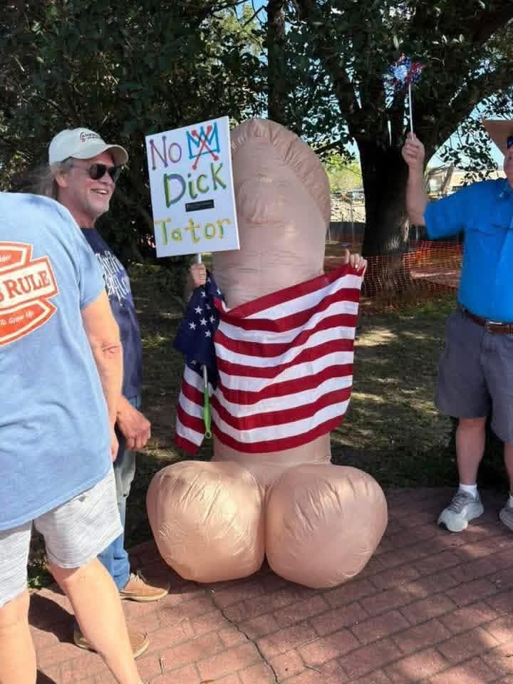 A 61-year-old Fairhope, Alabama woman dressed as a penis and carrying a “No Dick-tator” sign was arrested during Saturday’s “No Kings” protest.