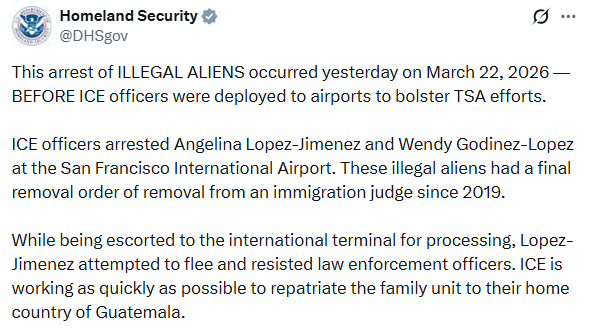 “We understand federal officers were transporting two individuals on an outbound flight when this incident occurred. We believe this is an isolated incident and have no reason to suspect broader enforcement action at SFO,” airport spokesman Doug Yakel said.