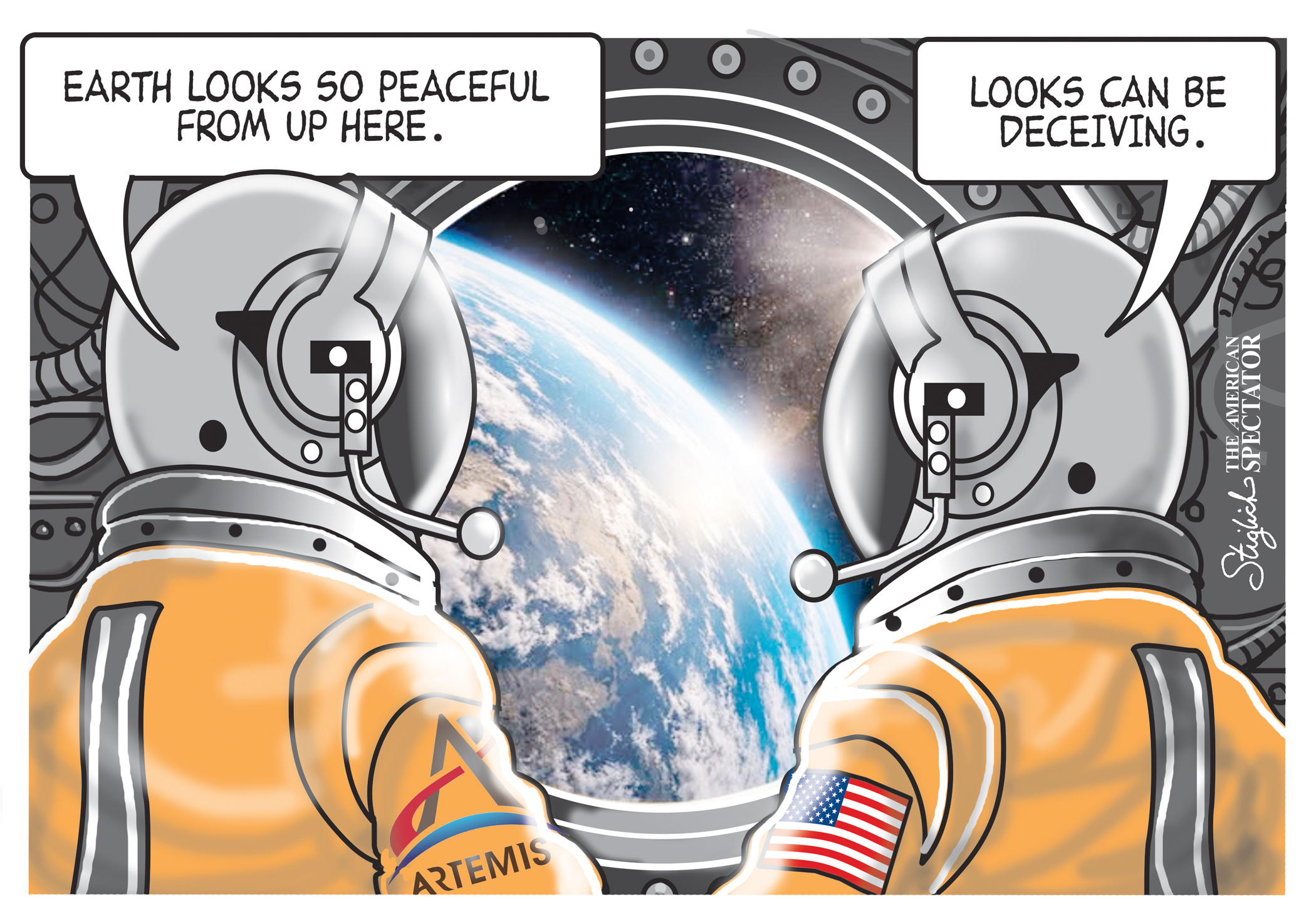 “Artemis,” editorial cartoon by Tom Stiglich for The American Spectator on April 6, 2026.
