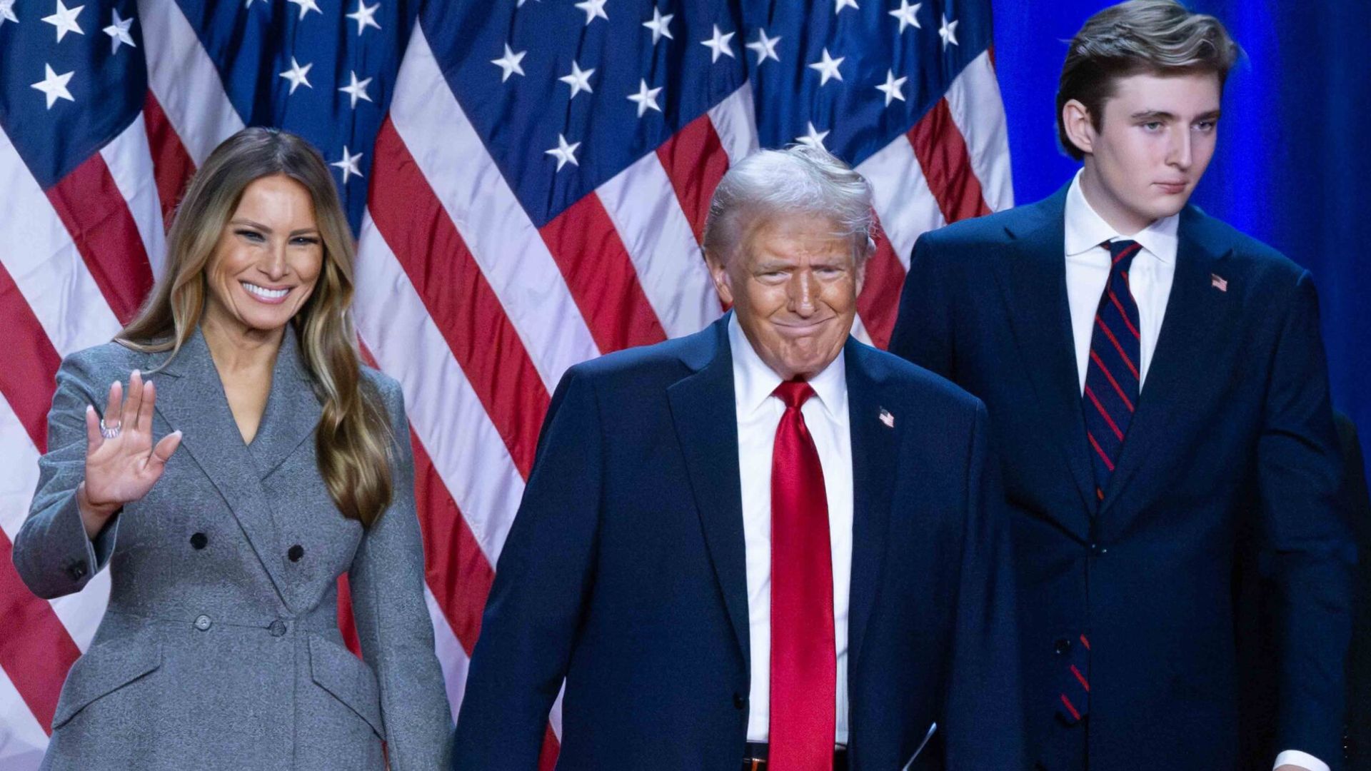 President Trump pumped his fist, clapped, and offered his signature thumbs-up while Melania Trump and Barron smiled and acknowledged attendees in the chandelier-lit room.