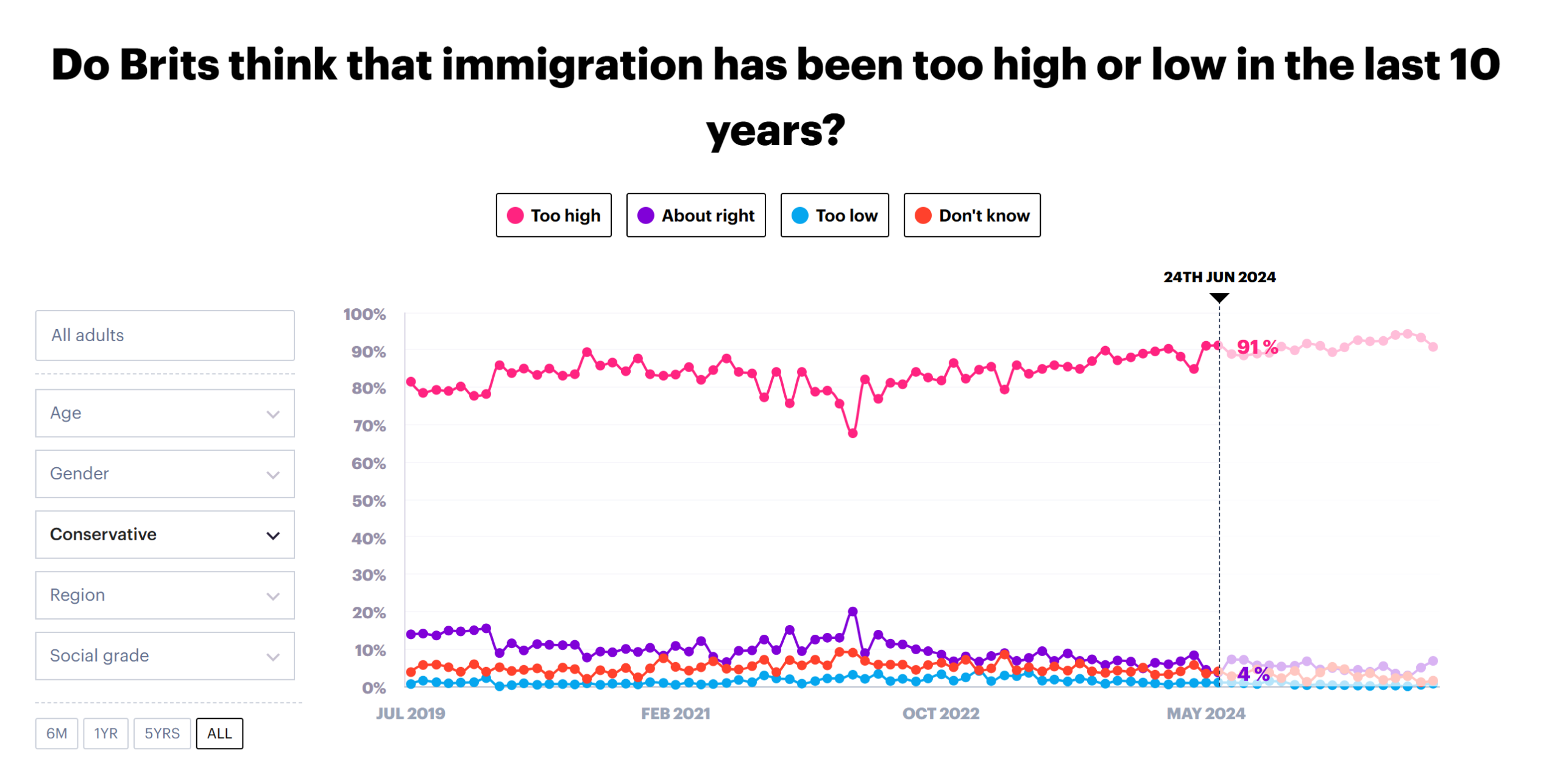 Even at the lowest point, in March 2022, 68 percent of Conservative voters thought immigration was too high, which is still a resounding majority that want lower immigration.