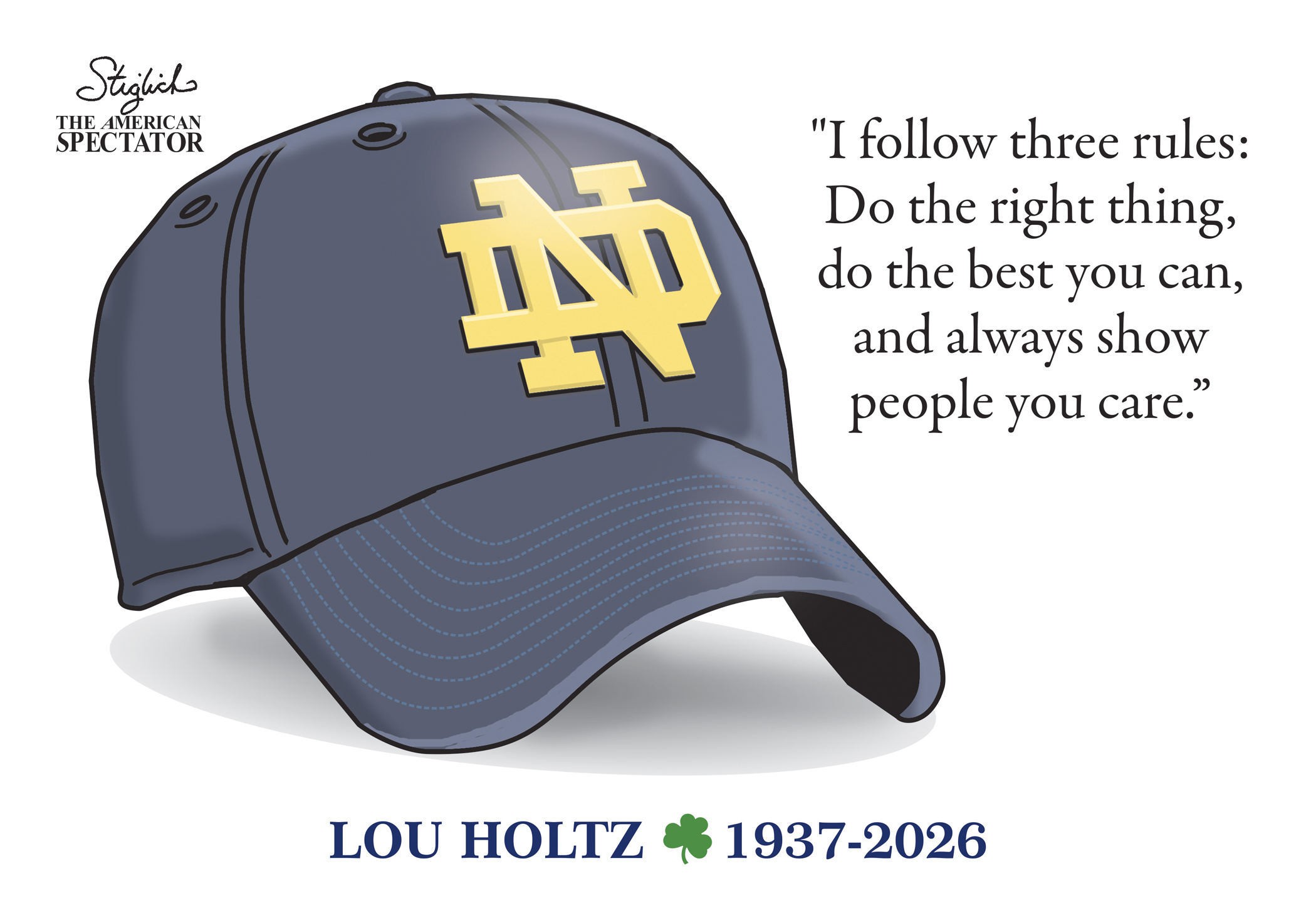 “Coach Lou Holtz,” editorial cartoon by Tom Stiglich for The American Spectator on Mar. 6, 2026.