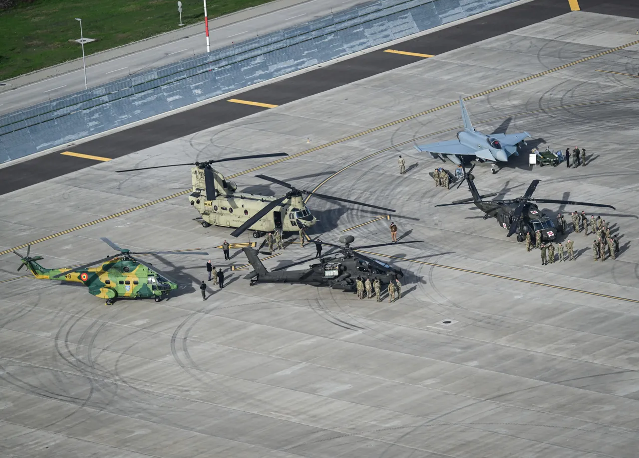 Aerial view of a static display showing from L to R: Romanian Air Forces’ Puma helicopter, US Army’s Chinook, US Army’s Apache, US Army’s medevac and a Typhoon jet fighter belonging to German Air Forces at the aerial base 57 in Mihail Kogalniceanu city, in Romania, on November 25, 2025. The United States reassured NATO member Romania on November 25 of its commitment to the country’s defence as Bucharest reported a fresh drone crash following Russian attacks on Ukraine. “The entire alliance and the US is committed to our presence here and always will be,” the US Army leader in Europe, Christopher Donahue, told reporters during a visit to the Mihail Kogalniceanu airbase. (Photo by Daniel MIHAILESCU / AFP via Getty Images)