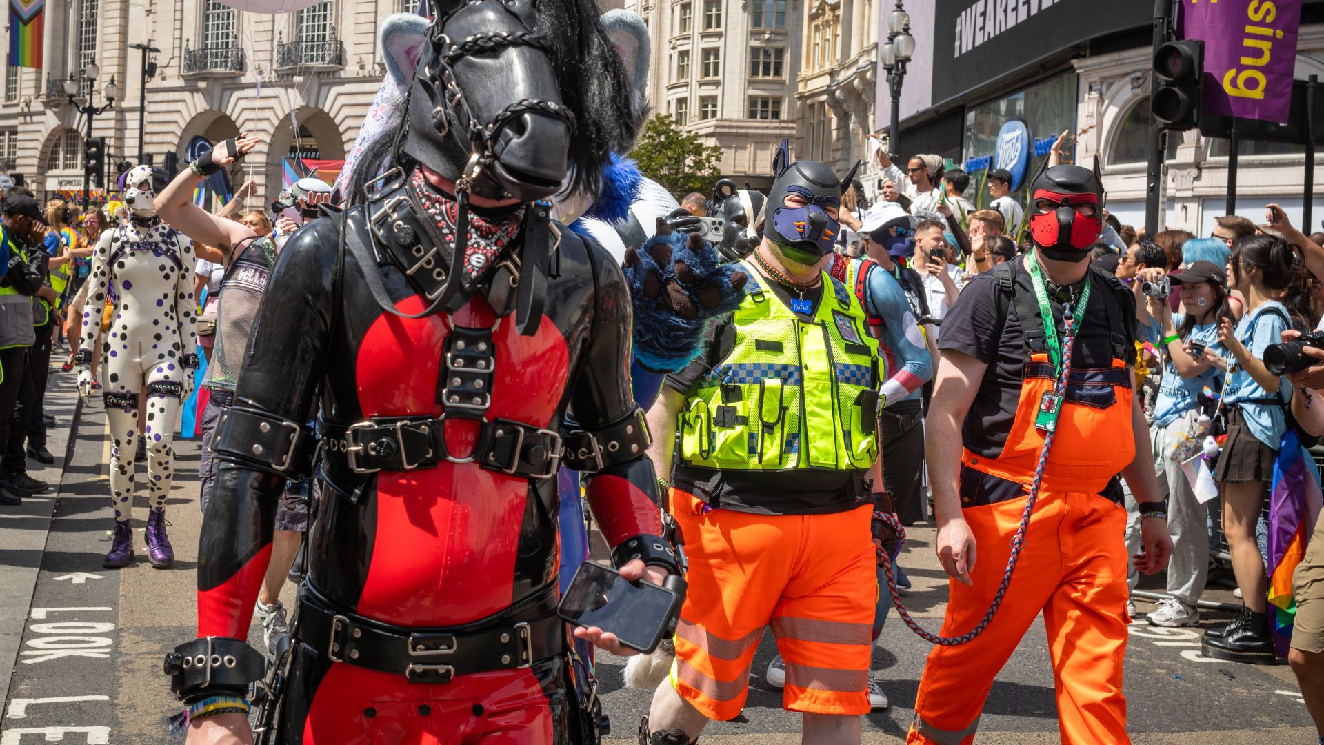 Other participants—some wearing dog masks associated with “puppy play” kink culture—were seen marching, howling, and carrying signs with slogans such as “paws off.”