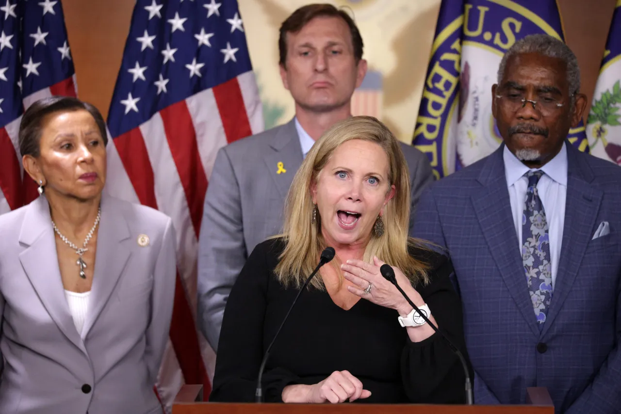 WASHINGTON, DC – JULY 02: Flanked by fellow House Democrats from New York State, U.S. Rep. Laura Gillen (D-NY) speaks out against the One, Big, Beautiful Bill Act at a press conference at the U.S. Capitol on July 2, 2025 in Washington, DC. (Photo by Alex Wong/Getty Images)