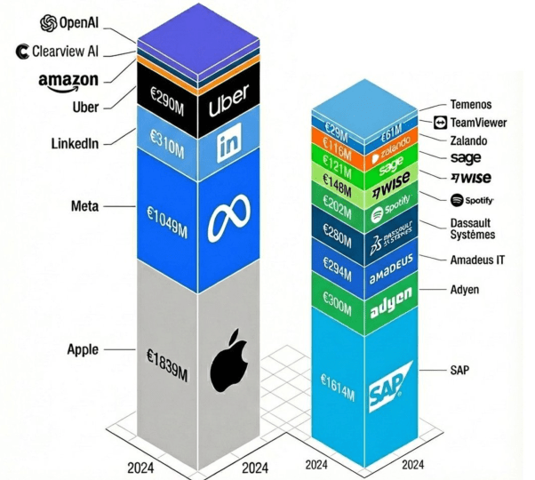 Look at the chart below. The EU makes more money by fining American companies that are actually bothering to innovate than it takes in tax from public European tech firms.
