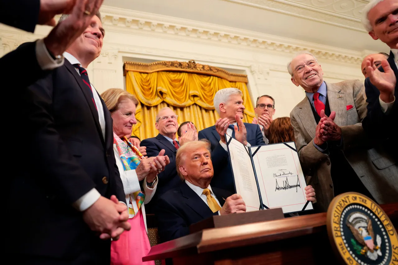 WASHINGTON, DC – JULY 16: U.S. President Donald Trump displays a signed bill during an event in the East Room of the White House on July 16, 2025 in Washington, DC. President Trump signed the HALT Fentanyl Act, which aims to permanently classify all fentanyl-related substances as schedule I controlled substances and aid law enforcement in prosecuting trafficking and manufacturing offenses. (Photo by Anna Moneymaker/Getty Images)