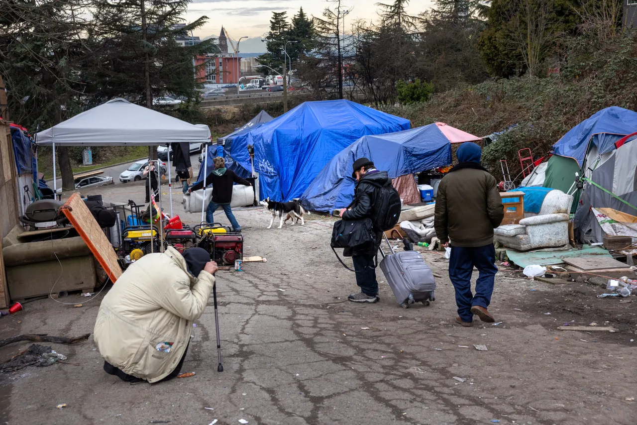 SEATTLE, WASHINGTON – MARCH 11: Residents of a homeless encampment walk through the encampment after smoking fentanyl on March 11, 2022 in Seattle, Washington. The city government is currently working to remove such encampments from shared spaces throughout Seattle. According to a recent report commissioned by Seattle Councilmember Andrew Lewis, the COVID-19 pandemic put undue pressure on the city’s shelter system and delayed funds for new housing, leading to an increase in homelessness. (Photo by John Moore/Getty Images)