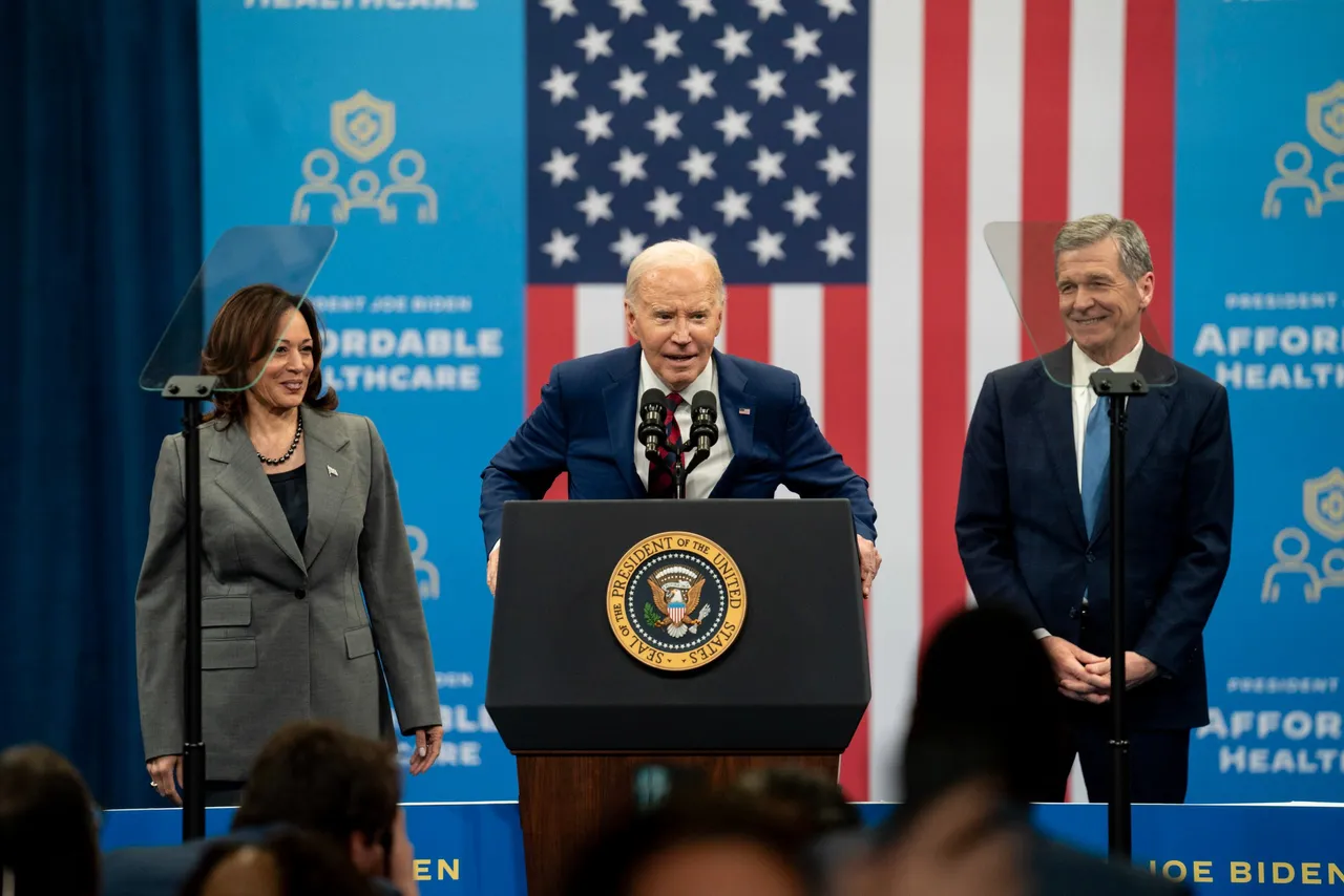 RALEIGH, NORTH CAROLINA – MARCH 26: U.S. President Joe Biden speaks at the Chavis community center with U.S. Vice President Kamala Harris and North Carolina Governor Roy Cooper on March 26, 2024 in Raleigh, North Carolina. (Photo by Eros Hoagland/Getty Images)