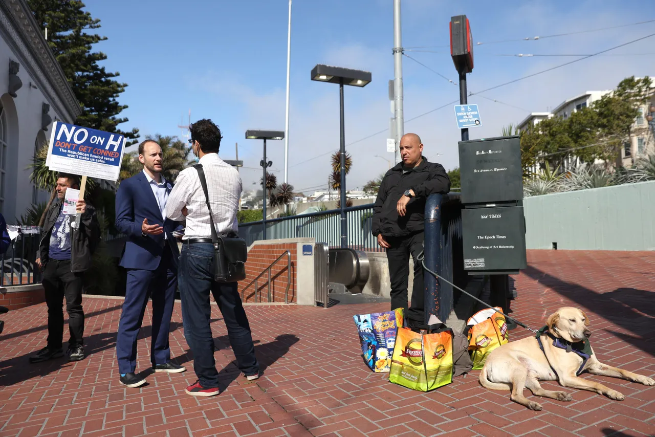 SAN FRANCISCO, CALIFORNIA – JUNE 07: San Francisco District Attorney Chesa Boudin (L) talks with a potential voter outside of the Castro Street MUNI station on June 07, 2022 in San Francisco, California. Boudin is facing a recall election as San Francisco voters head to the polls on primary election day. (Photo by Justin Sullivan/Getty Images)