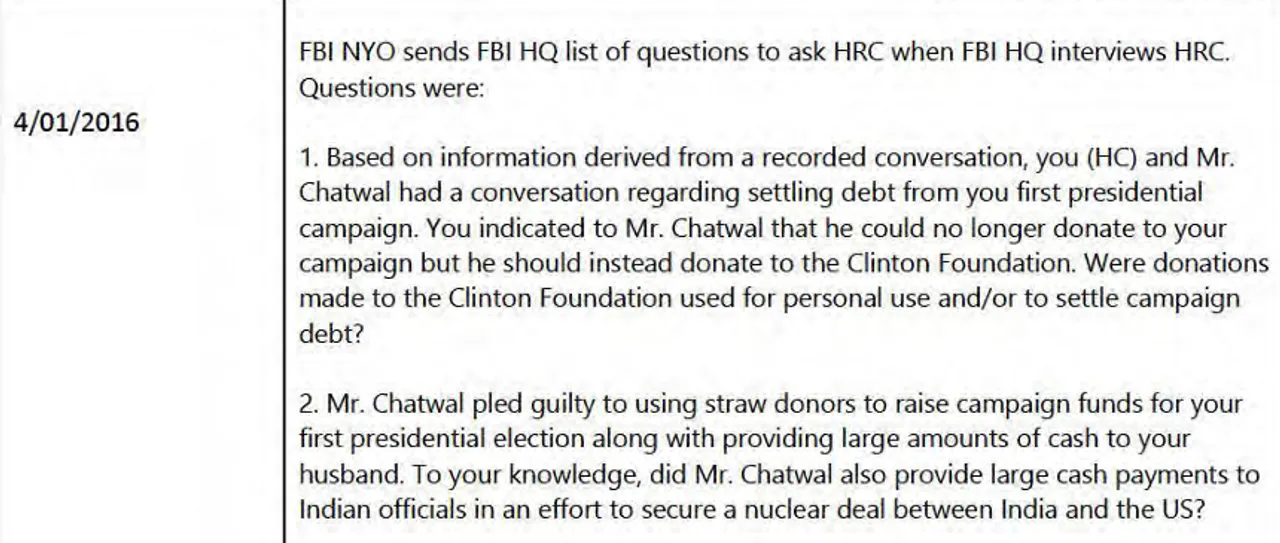 “Based on information derived from a recorded conversation, you (HC) and Mr. Chatwal had a conversation regarding settling debt,” the agents wanted to ask Clinton. “You indicated to Mr. Chatwal that he could no longer donate to your campaign but he should instead donate to the Clinton Foundation. Were donations made to the Clinton Foundation used for personal use and/or to settle campaign debt?” (p. 22)