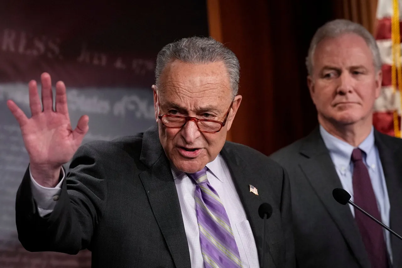 WASHINGTON, DC – FEBRUARY 2: Senate Majority Leader Chuck Schumer (D-NY) speaks as Sen. Chris Van Hollen (D-MD) looks on during a news conference at the U.S. Capitol February 2, 2023 in Washington, DC. (Photo by Drew Angerer/Getty Images)