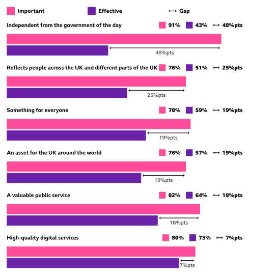 Just 43% of BBC viewers believe the broadcaster is effective in being ‘independent from the government of the day’, according to the BBC’s own data. Of the 872,701 viewers polled, 91% believe that independence should be important. A whopping 48 point gap…