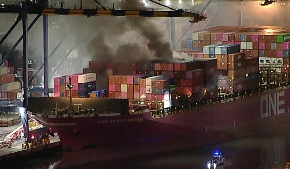 LOS ANGELES — A fire that broke out aboard a Los Angeles container ship on Friday continued to burn overnight, prompting a shelter in place order for surrounding communities over concerns about hazardous materials within the ship’s cargo.