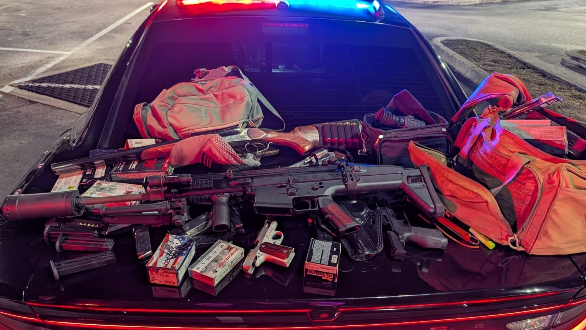 Police said they located a “multitude of firearms and ammunition, firearm magazine speed loaders, thermal scopes, knives, a battering ram, night vision goggles, cannabis, and gummies, which tested positive for THC.”