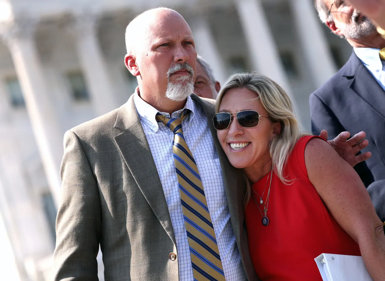 WASHINGTON, DC – AUGUST 23, 2021: U.S. Rep. Chip Roy (R-TX) embraces Rep. Marjorie Taylor Greene (R-GA) during a news conference on the infrastructure bill with fellow members of the House Freedom Caucus, outside the Capitol Building on August 23, 2021 in Washington, DC. (Photo by Kevin Dietsch/Getty Images)
