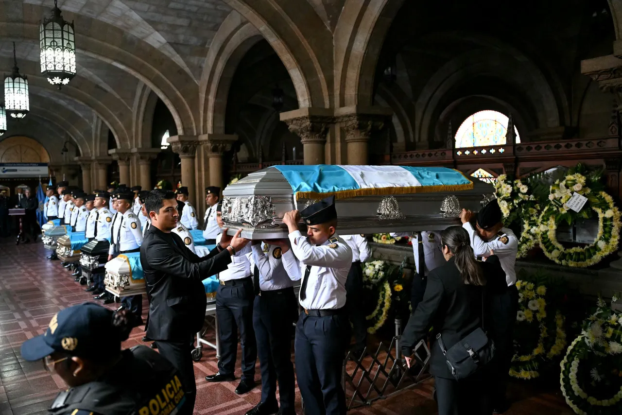 Policemen stand by the coffins of slain police personnel as officers carry one of the caskets during a funeral ceremony at the Interior Ministry headquarters in Guatemala City on July 19, 2026. Guatemala’s president on July 18 declared a 30-day nationwide state of emergency to combat criminal gangs after authorities accused the groups of killing eight police officers and holding hostages at three prisons. (Photo by JOHAN ORDONEZ / AFP via Getty Images)