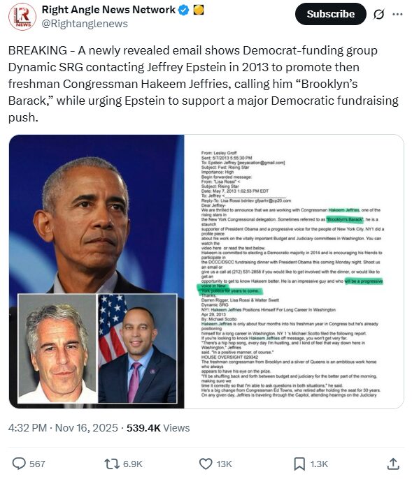 The email showed that a Democratic-aligned funding group contacted Epstein in 2013 regarding Jeffries, referring to him as “an impressive guy” who “will be a progressive voice in New York politics for years to come.”