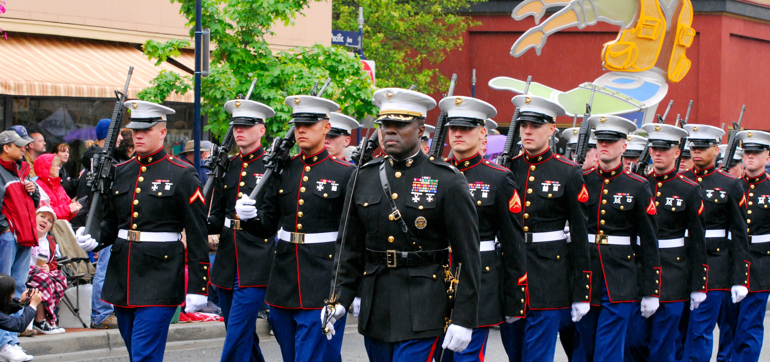 And then the show begins. The precision drill teams the Marines have are expert in the best sense of the word. When I saw the sergeant walking through two lines of Marines throwing spinning bayonet-tipped rifles across his path, it was the most awesome display I’ve ever seen on a drill field.