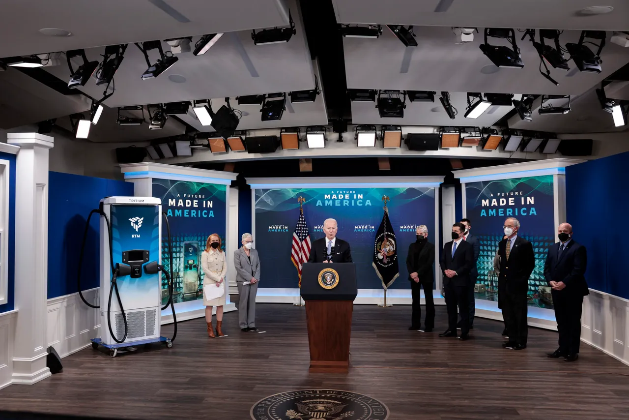 WASHINGTON, DC – FEBRUARY 08: U.S. President Joe Biden (C), joined by Tritium’s CEO Jane Hunter (L) and members of his administration and Congress, delivers remarks on his administration’s efforts to increase manufacturing, in the South Court Auditorium at the Eisenhower Executive Office Building on February 08, 2022 in Washington, DC. Biden announced plans for Tritium to construct a new electric vehicle charging plant in Tennessee. (Photo by Anna Moneymaker/Getty Images)