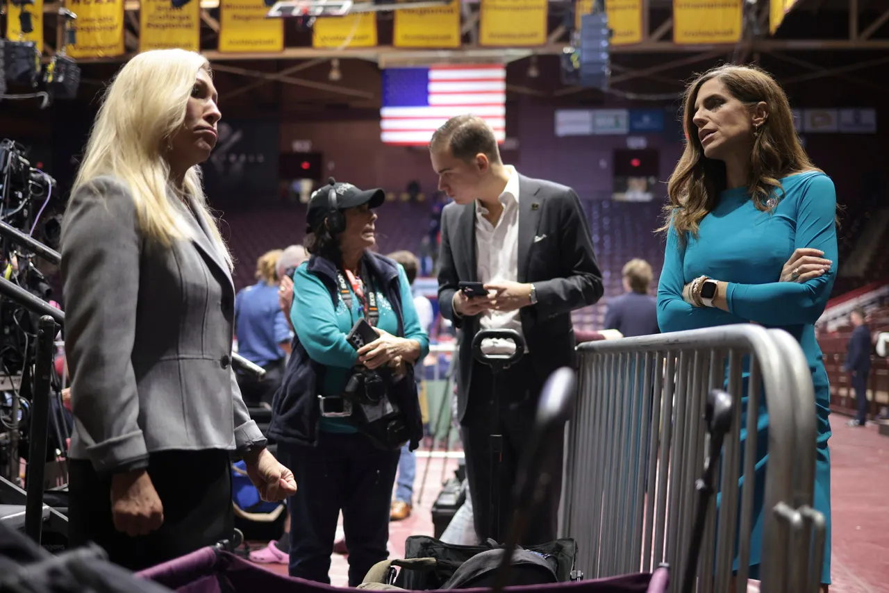 ROCK HILL, SOUTH CAROLINA – Rep. Marjorie Taylor Greene (L) (R-GA) and Rep. Nancy Mace (R) (R-SC) talk before then-Republican presidential candidate and former President Donald Trump speaks at a Get Out The Vote rally at Winthrop University on February 23, 2024 in Rock Hill, South Carolina. Mace is leaving Congress in hopes of becoming governor of South Carolina. (Photo by Win McNamee/Getty Images)
