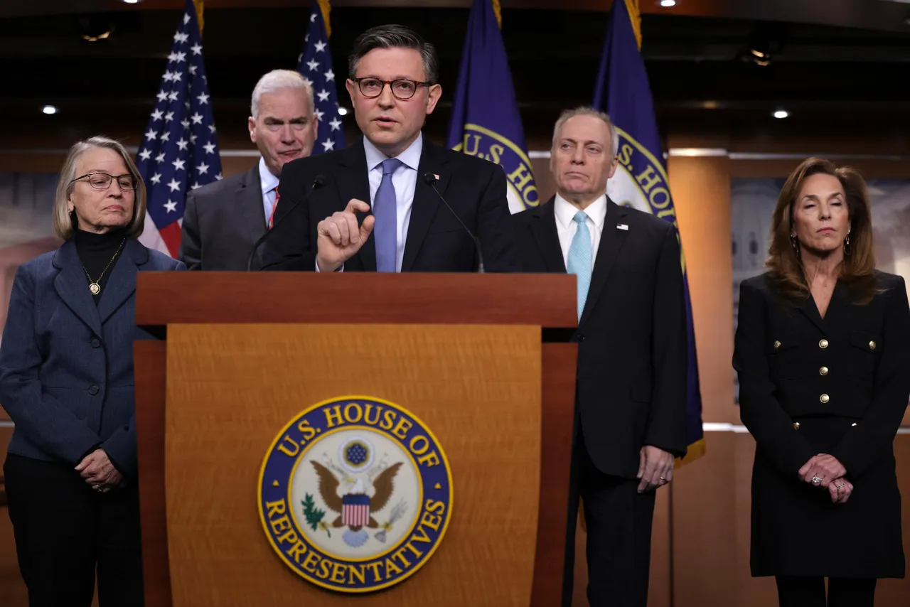 WASHINGTON, DC – DECEMBER 16: U.S. Speaker of the House Rep. Mike Johnson (R-IL) speaks as (L-R) Rep. Mariannette Miller-Meeks (R-IA), House Majority Whip Rep. Tom Emmer (R-MN), House Majority Leader Rep. Steve Scalise (R-IL) and House Republican Conference Chair Rep. Lisa McClain (R-MI) listen during a news conference at the U.S. Capitol on December 16, 2025 in Washington, DC. House Republican leadership held a news conference to discuss GOP agenda. (Photo by Alex Wong/Getty Images)
