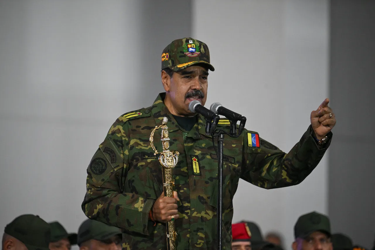 Venezuela’s President Nicolas Maduro delivers a speech while holding the Venezuelan independence hero Simon Bolivar’s ‘Sword of Peru’ during a military ceremony in Fuerte Tiuna, Caracas on November 25, 2025. (Photo by Federico PARRA / AFP via Getty Images)