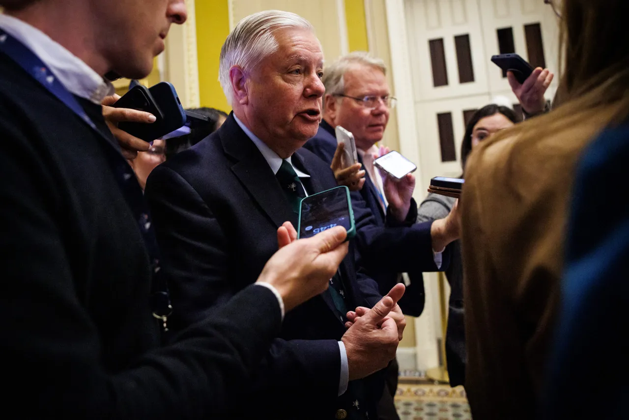 WASHINGTON, DC – NOVEMBER 7: U.S. Sen. Lindsey Graham (R-SC) talks to reporters as he leaves a Republican Caucus meeting at the U.S. Capitol on November 7, 2025 in Washington, DC. Lawmakers continue to negotiate as the government shutdown reaches its 38th day, the longest in U.S. history. (Photo by Samuel Corum/Getty Images)