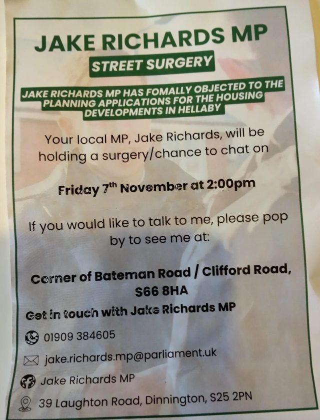 Serial blocker Rother Valley Labour MP Jake Richards is continuing his campaign against the party’s vaunted ‘build baby build’ initiative. Richards is now opposing 101 homes in Hellaby. This time, rather than going through the humiliation of posting his NIMBYism online, Richards opted for the old-fashioned leaflet to confirm his objection. Notably there’s no mention of the fact he is a Labour MP and he only uses the inoffensive Commons green colours…
