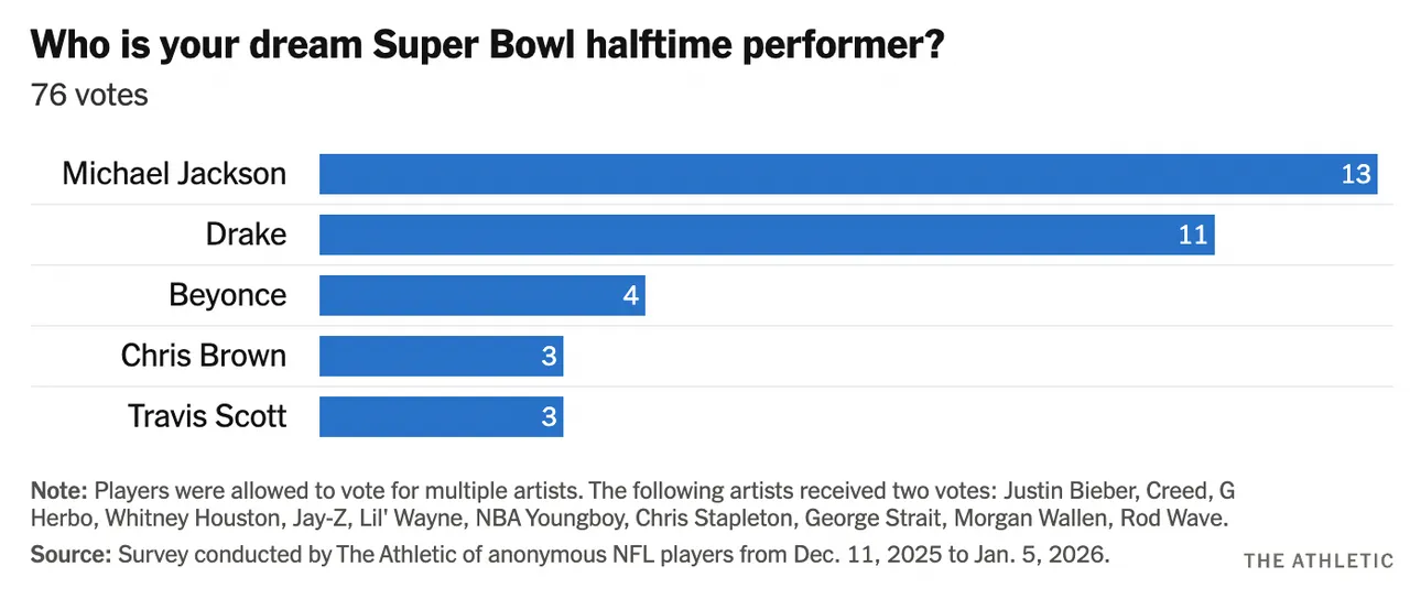 When asked who would be their dream halftime performer, 13 players said the deceased Michael Jackson, 11 said rap star Drake, and 4 said Beyoncé. Several other big artists and bands, including Creed, Chris Stapleton, George Strait, and Morgan Wallen, received 2 votes each.