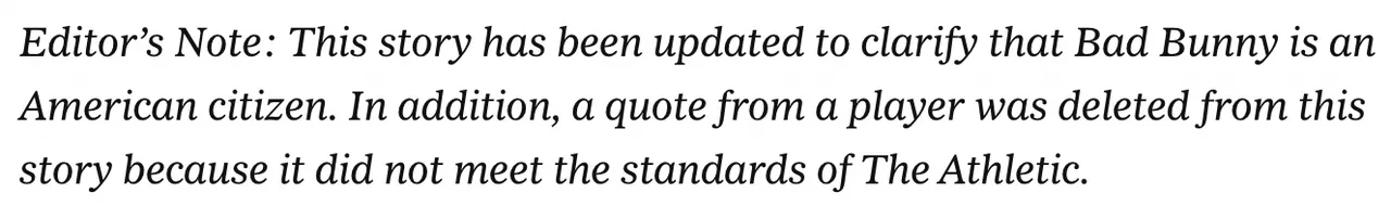 Note: Bad Bunny is from Puerto Rico but still an American citizen. It appears The Athletic had to tuck this in after the fact in an editor’s note. The outlet also admitted to cutting a player’s quote that failed to meet their “standards.” The Daily Caller has contacted The New York Times regarding this nixed quote.