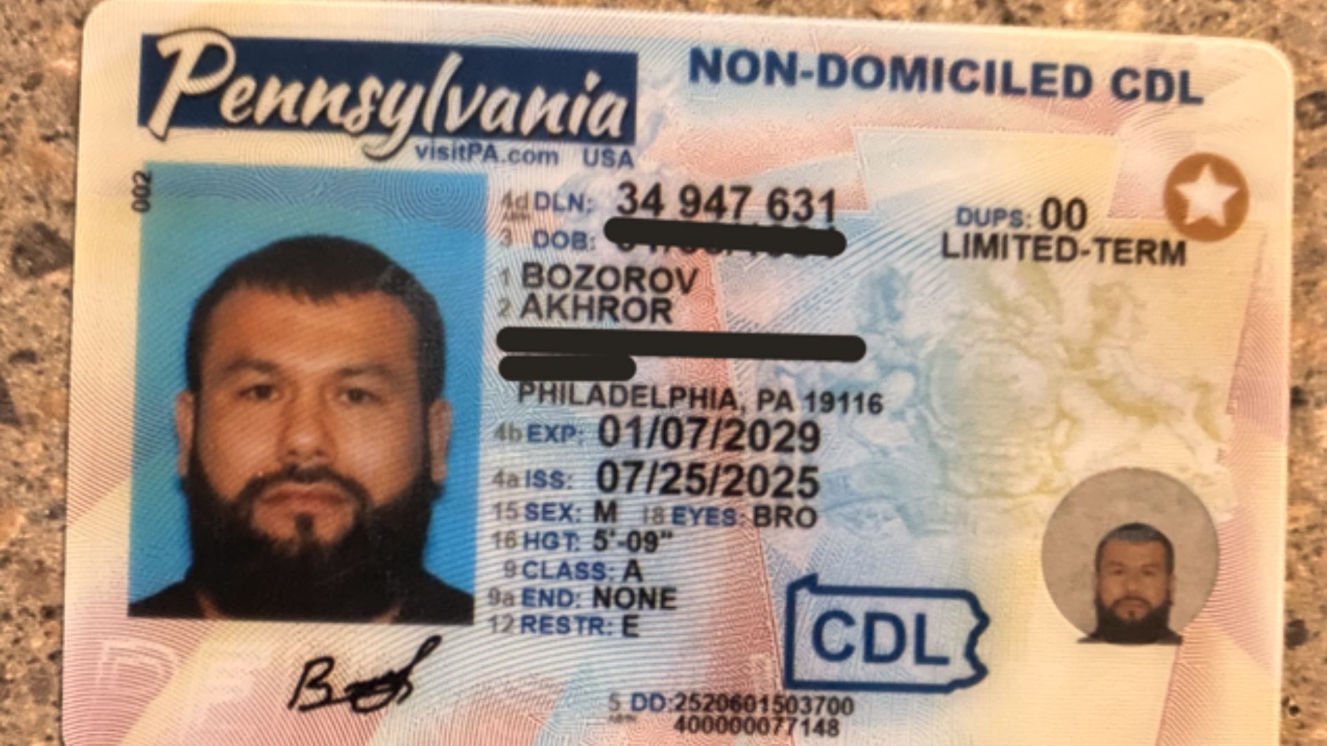 A photograph of Bozorov’s license, shared by DHS, showed that Pennsylvania issued him a non-domiciled CDL with REAL ID in July.