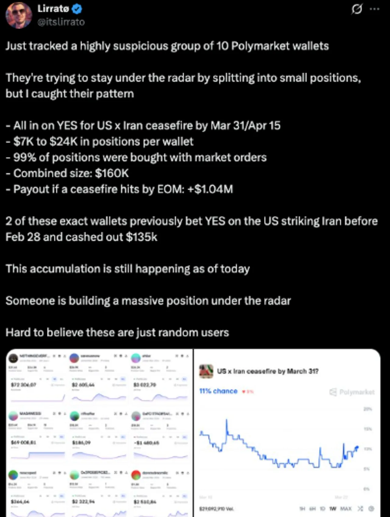 And now it looks like there might be more insider trading. Polymarket wallets that made the oddly specific bet on the war popping off before Feb. 28 are now pegging the end of hostilities for March 31/April 15.