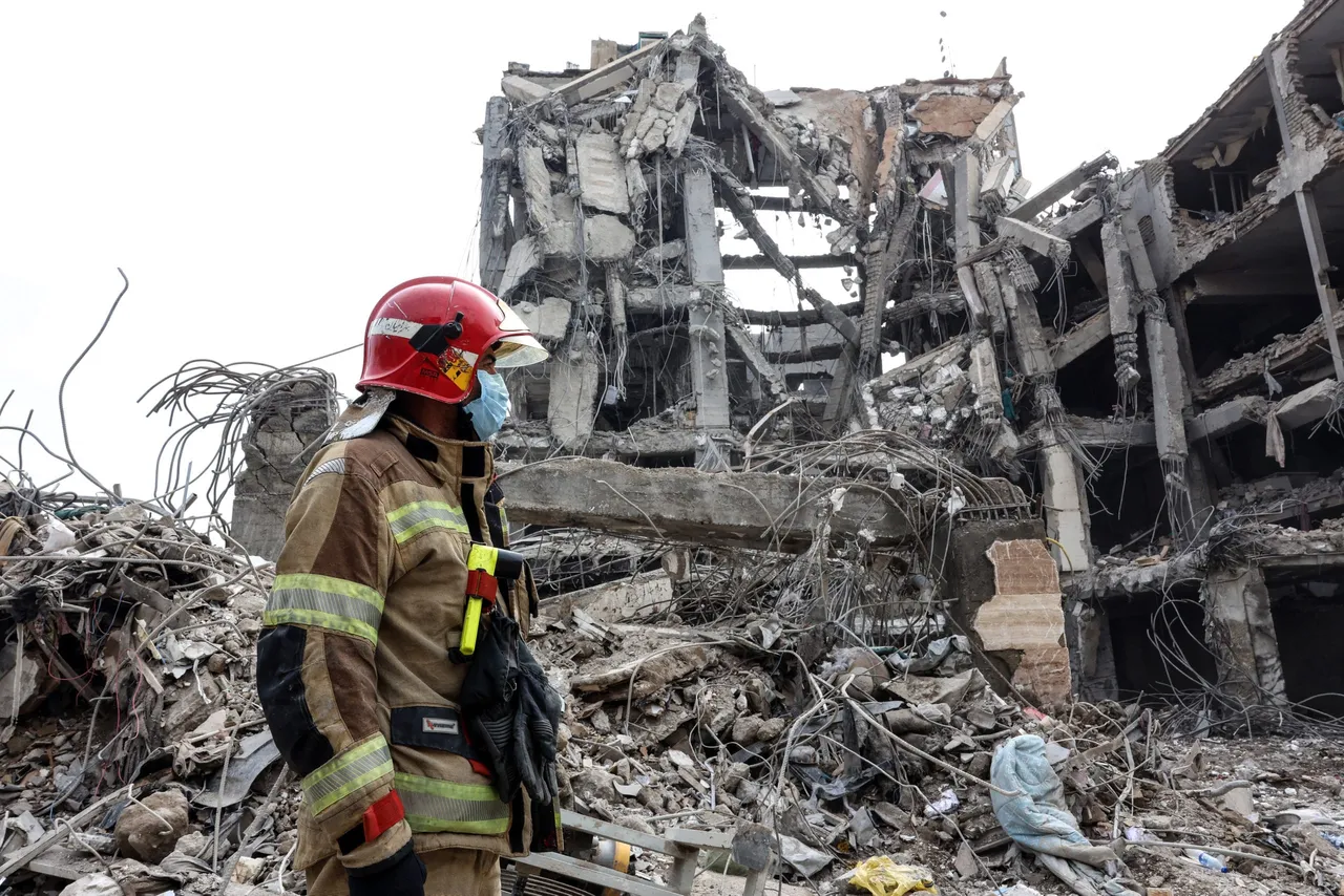 A firefighter stands in front of the ruins of a residential building in Tehran on March 12, 2026. The United States and Israel started striking Iran on February 28, killing the Iranian supreme leader and top military leaders, and prompting authorities to retaliate with strikes on Israel and across the Gulf. (Photo by AFP via Getty Images) /