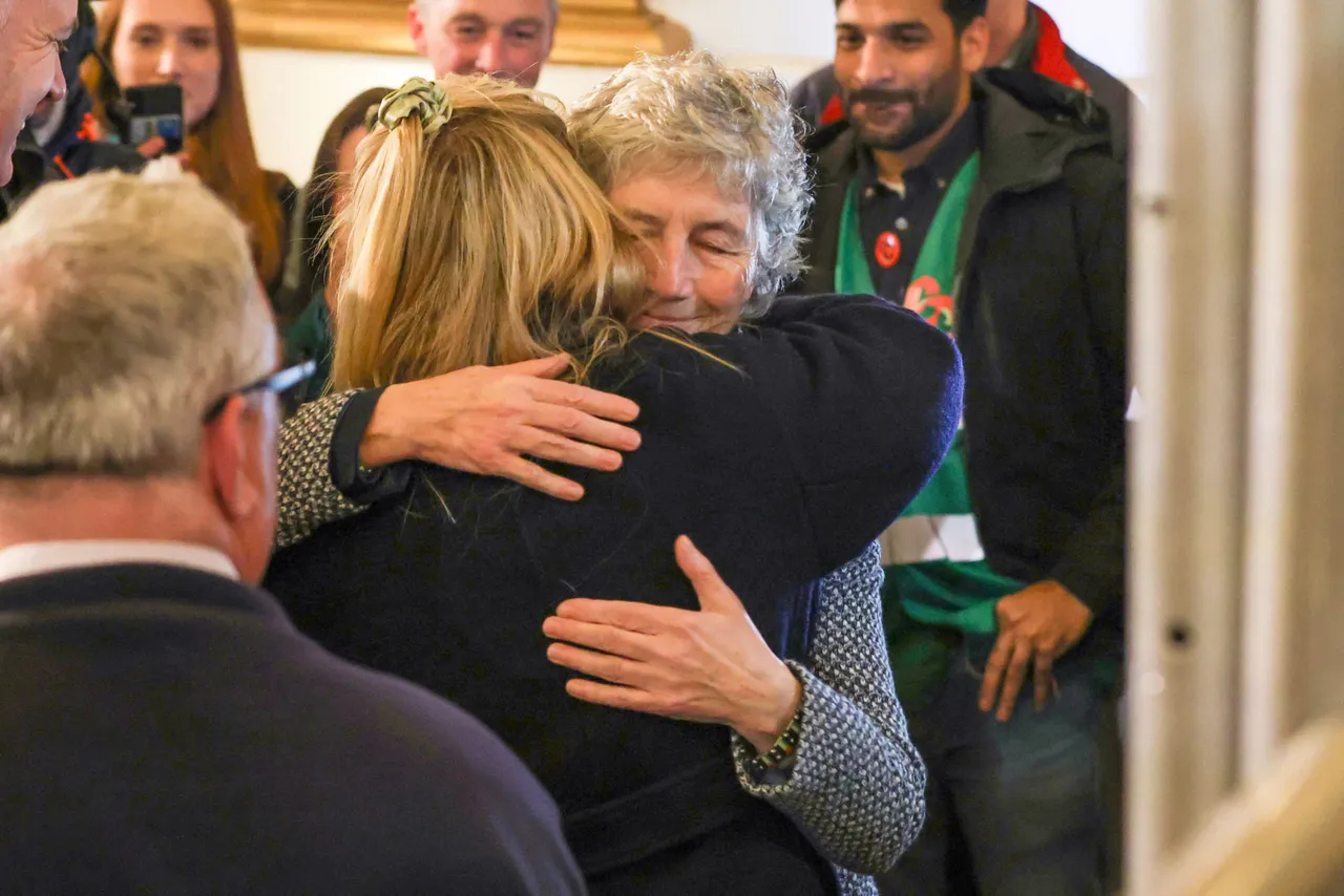 Catherine Connolly (C) arrives at Dublin Castle, after being declared the winner in the Presidential election to become the next President of Ireland in Dublin on October 25, 2025. (Photo by PAUL FAITH/AFP via Getty Images)