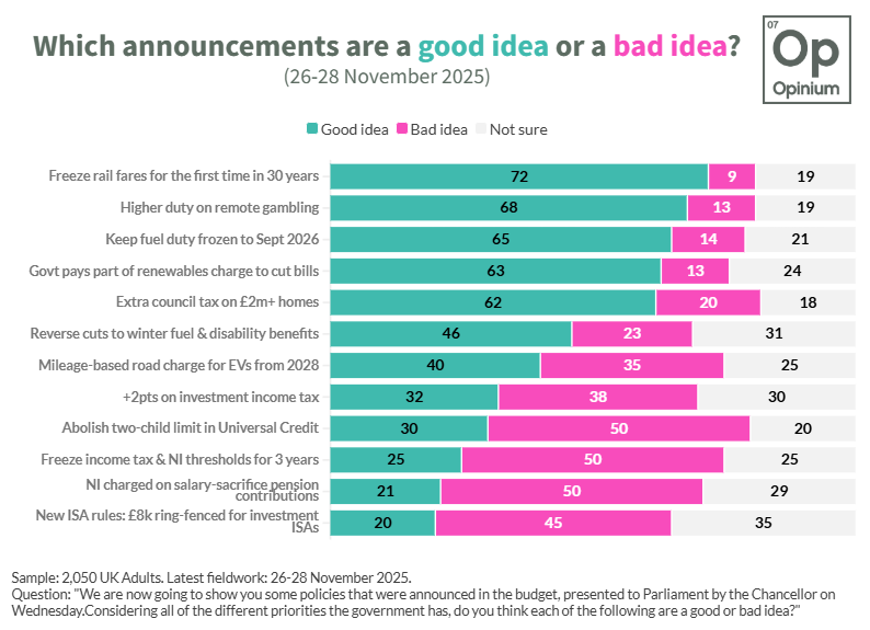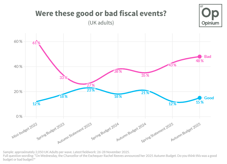 I first wrote this in March, when 43 per cent said the Spring Statement she delivered was bad in the immediate post-event polling, while only 12 per cent said it was good. Fast forward to her 2025 Autumn Budget, and almost half (48 per cent) of UK adults think it was a bad Budget, while only 15 per cent think it was good, according to the latest Opinium polling this week for The Observer.