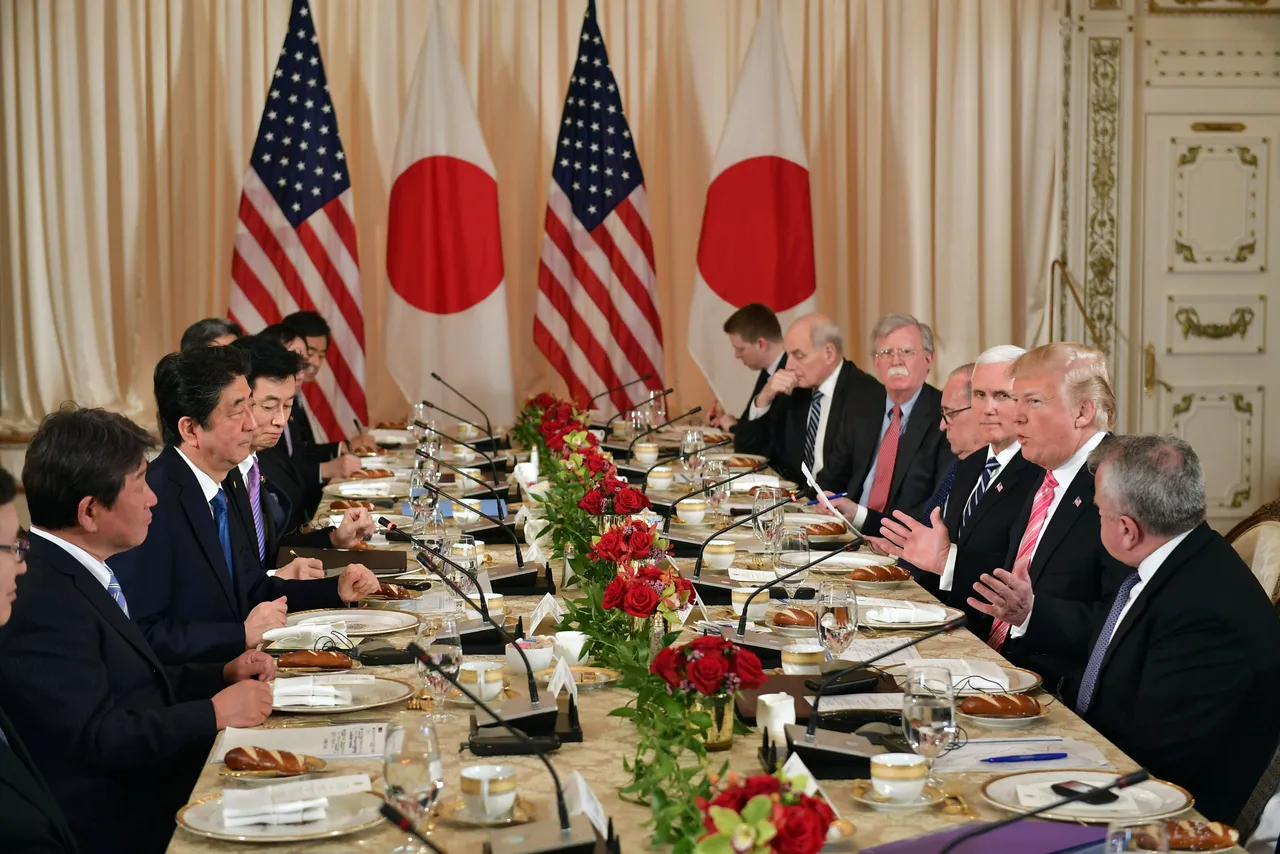 US President Donald Trump and Japan’s Prime Minister Shinzo Abe take part in a working lunch at Trump’s Mar-a-Lago estate in Palm Beach, Florida on April 18, 2018. (Photo: MANDEL NGAN/AFP via Getty Images)