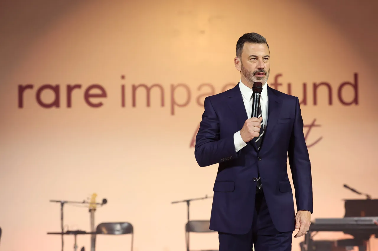 LOS ANGELES, CALIFORNIA – OCTOBER 29: Jimmy Kimmel speaks onstage during the Third Annual Rare Impact Fund Benefit hosted by Selena Gomez at Nya Studios on October 29, 2025, in Los Angeles, California. (Photo by Amy Sussman/Getty Images for Rare Impact Fund)