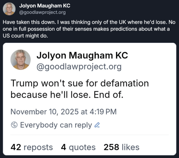 The BBC has suffered a major blow as it loses the support of heavy-hitting legal mind Jolyon Maugham – trying his hardest to predict the result of any legal battle between the corporation and Donald Trump. Guido can only imagine it is full-blown crisis mode in Broadcasting House…