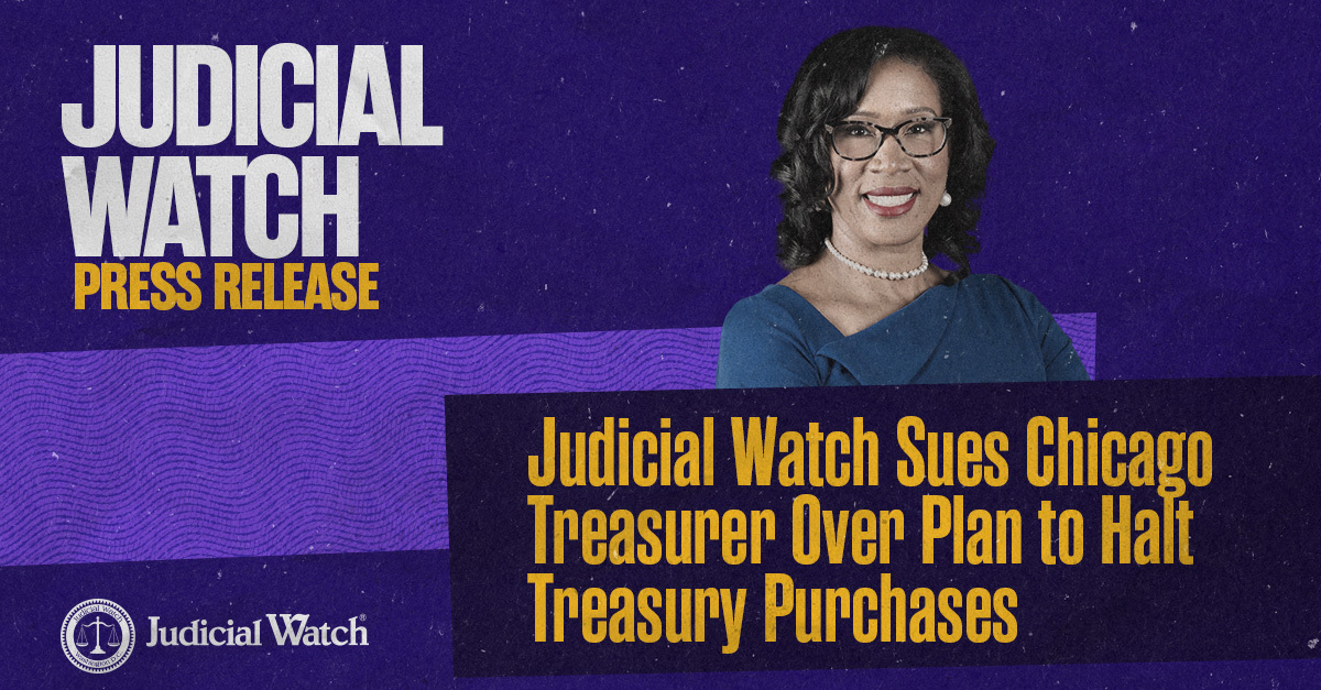 (Washington, DC) – Judicial Watch announced today it filed an Illinois Freedom of Information Act (FOIA) lawsuit against Melissa Conyears-Ervin, treasurer of the City of Chicago, for details of her declared plan to stop buying new U.S. Treasury securities and divest the city of indirect holdings (Judicial Watch Inc. v. Chicago Treasurer’s Office (No. 2026CH00302)).