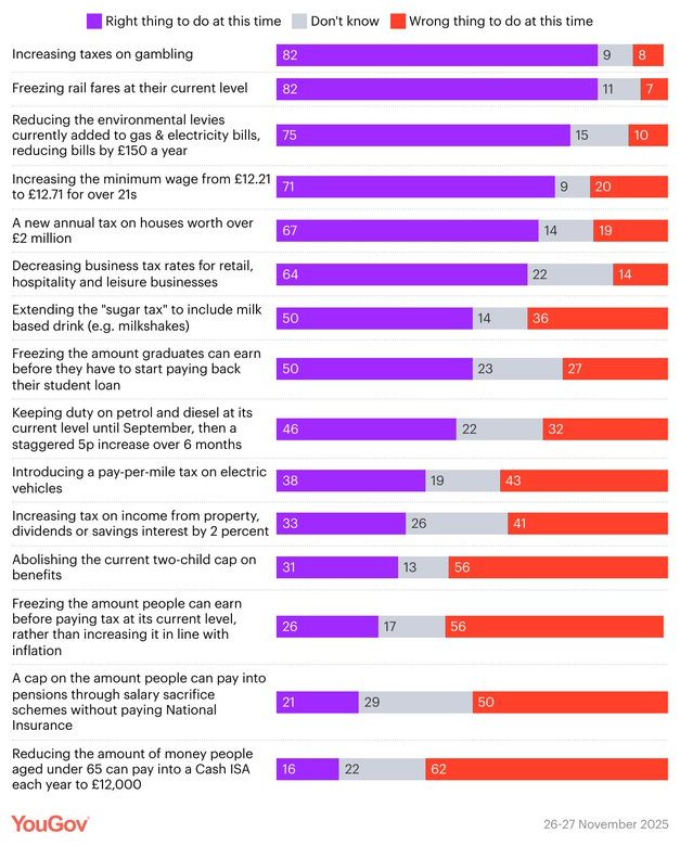 YouGov has done some snap polling on the Winter Budget. Despite the welfare spending splurge, 50% of Brits say the Budget will leave their family worse off, compared to just 3% of Brits who say it will leave their family better off. 47% of Brits think it will leave the country worse off while 9% think it will leave the country better off. Zero people think the economy is now in a “very good state” and only 11% say Reeves is a good Chancellor…