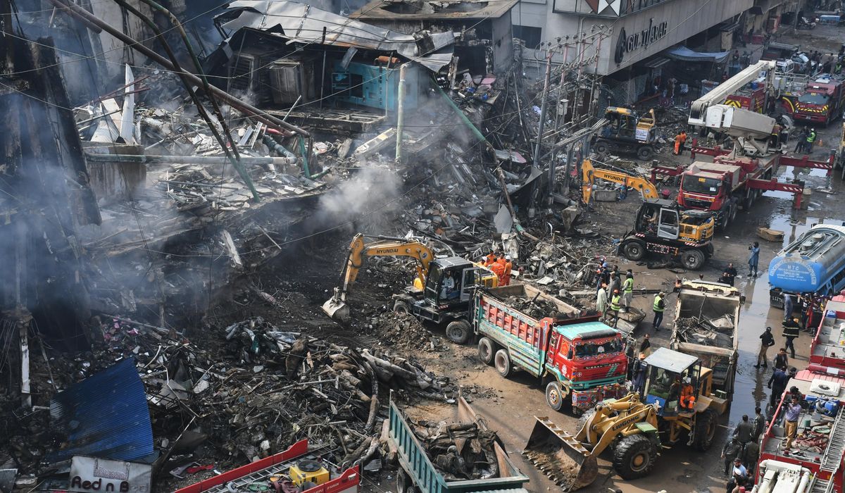 Firefighters extinguished the blaze at the multistory plaza late Sunday, nearly 24 hours after it erupted, allowing rescue teams to enter the building. Authorities fear the death toll will rise as they look for 46 more people, according to city police chief Asad Raza.