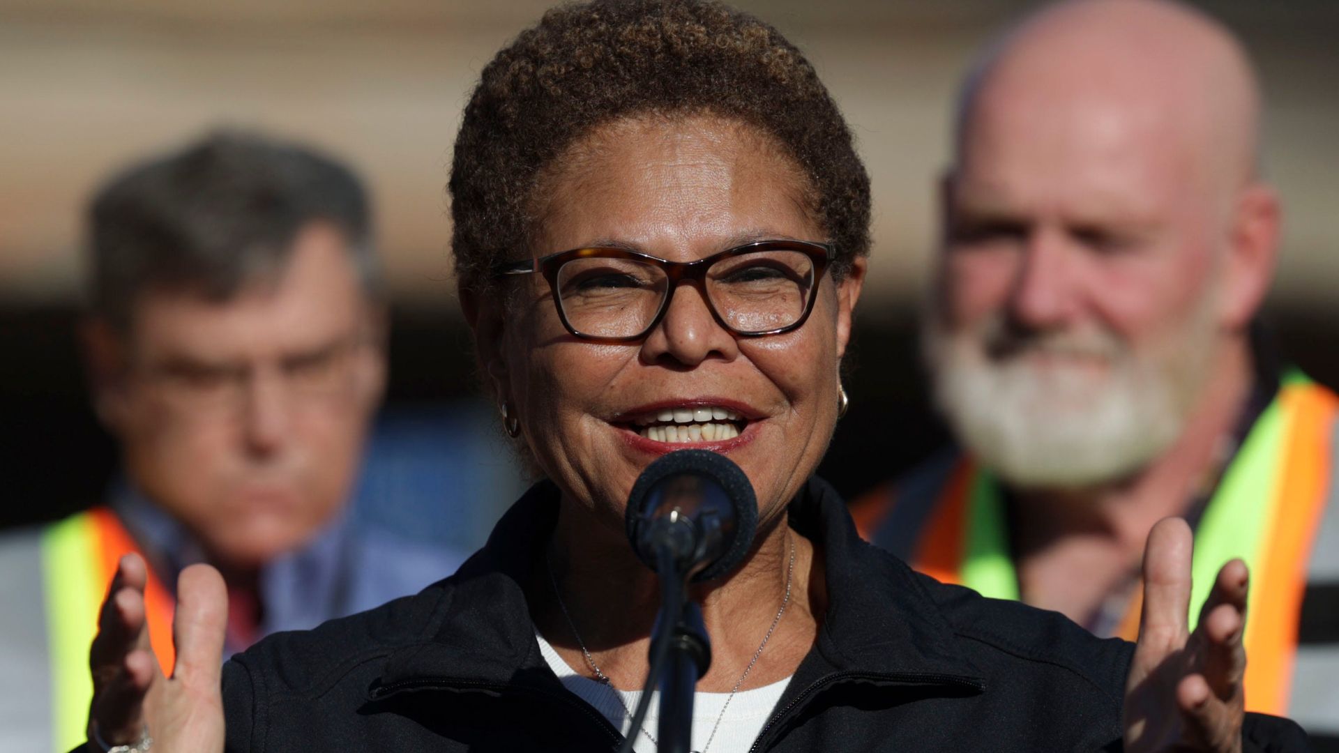Bass visited the Pacific Palisades to promote the completion of a home she presented as an early sign of recovery after last year’s wildfire, which destroyed thousands of structures across the area.