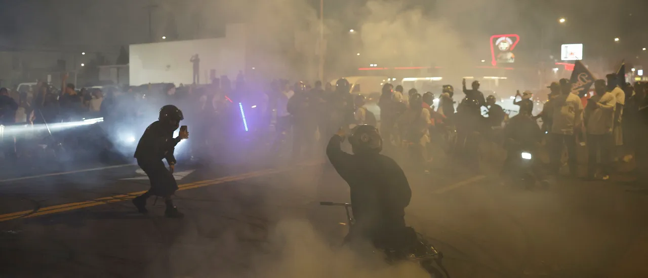 The chaos extended beyond downtown. Roughly 350 to 400 people gathered at an intersection in the Pacoima neighborhood, where several cars performed donuts and burnouts. A crowd downtown allegedly vandalized an autonomous vehicle.