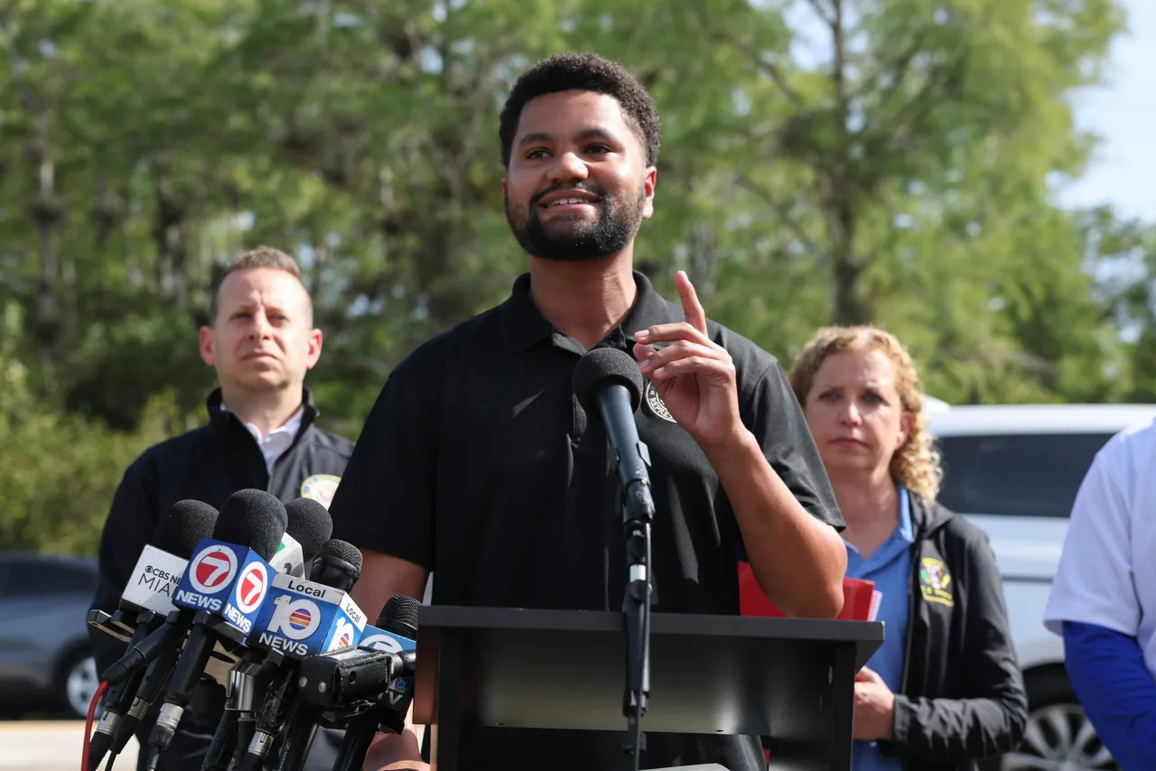 OCHOPEE, FLORIDA – JULY 12: Rep. Maxwell Frost (D-FL), along with Rep. Jared Moskowitz (D-FL) and Rep. Debbie Wasserman Schultz (D-FL) hold a press conference before visiting “Alligator Alcatraz” at the Dade-Collier Training and Transition Airport on July 12, 2025, in Ochopee, Florida. (Photo by Joe Raedle/Getty Images)