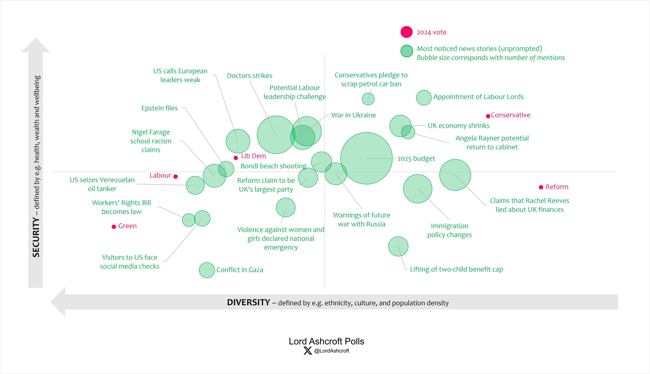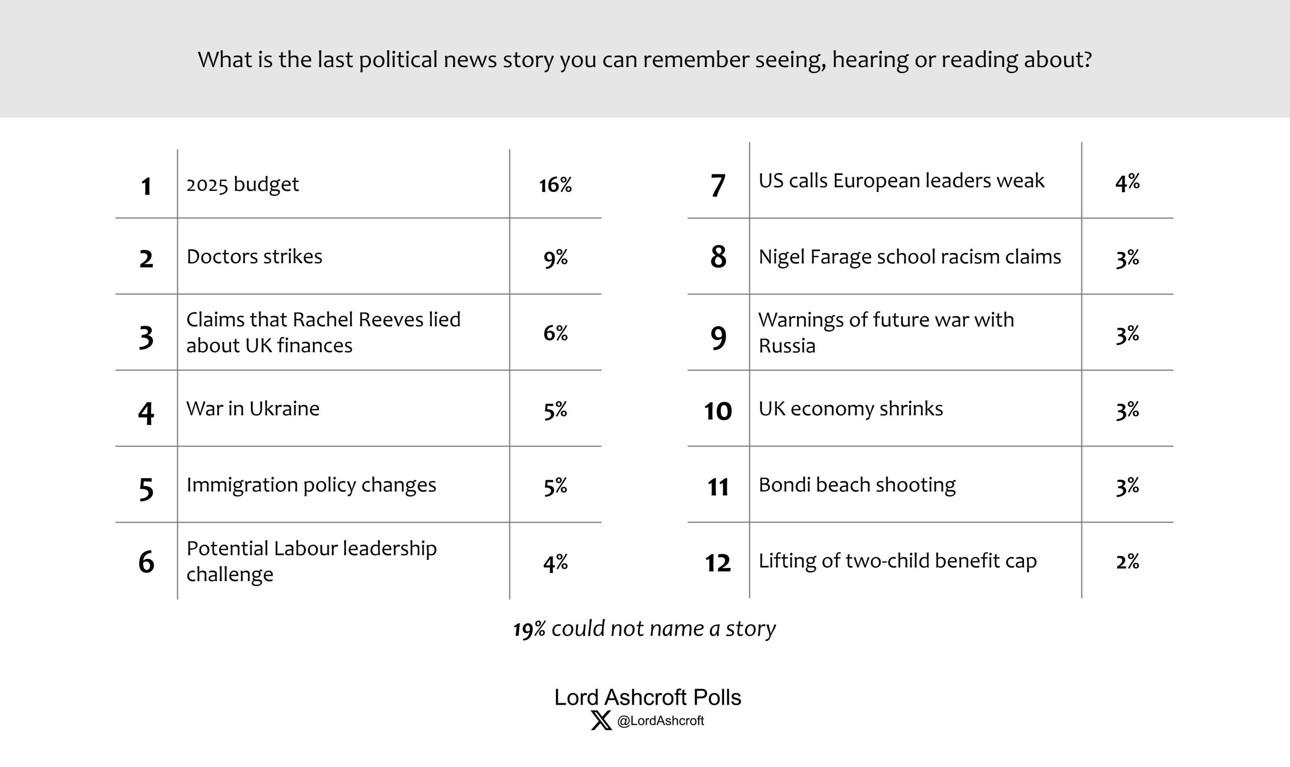 The Budget dominated people’s recollections of recent political news, especially when combined with stories about Rachel Reeves allegedly making misleading statements about the state of the public finances. Doctors’ strikes were the second most likely to be mentioned. The Bondi Beach shootings occurred midway through fieldwork, hence their relatively low position on the list.