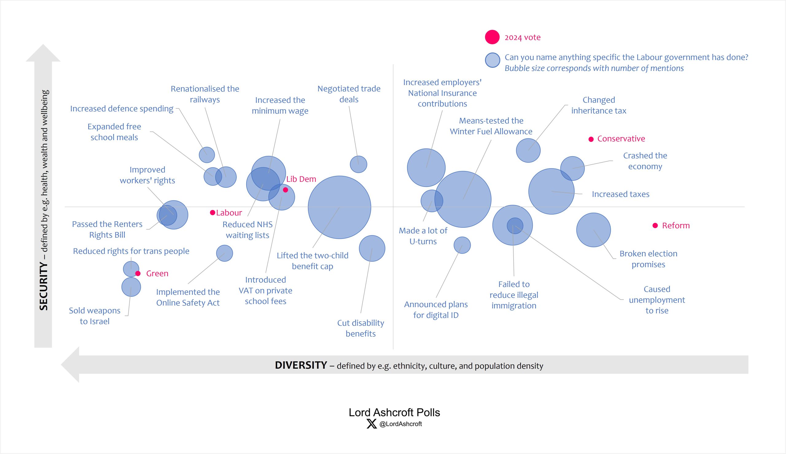 Lifting the two-child benefit cap appears close to the centre, but slightly towards Labour and Lib Dem-leaning territory. Winter fuel, tax rises, digital ID, U-turns and failures on illegal migration were more likely to be recalled in right-leaning parts of the map, while actions including raising the minimum wage, the Online Safety Act, raising defence spending and expanding free school meals were most likely to be mentioned in Labour and Lib Dem-leaning territory.