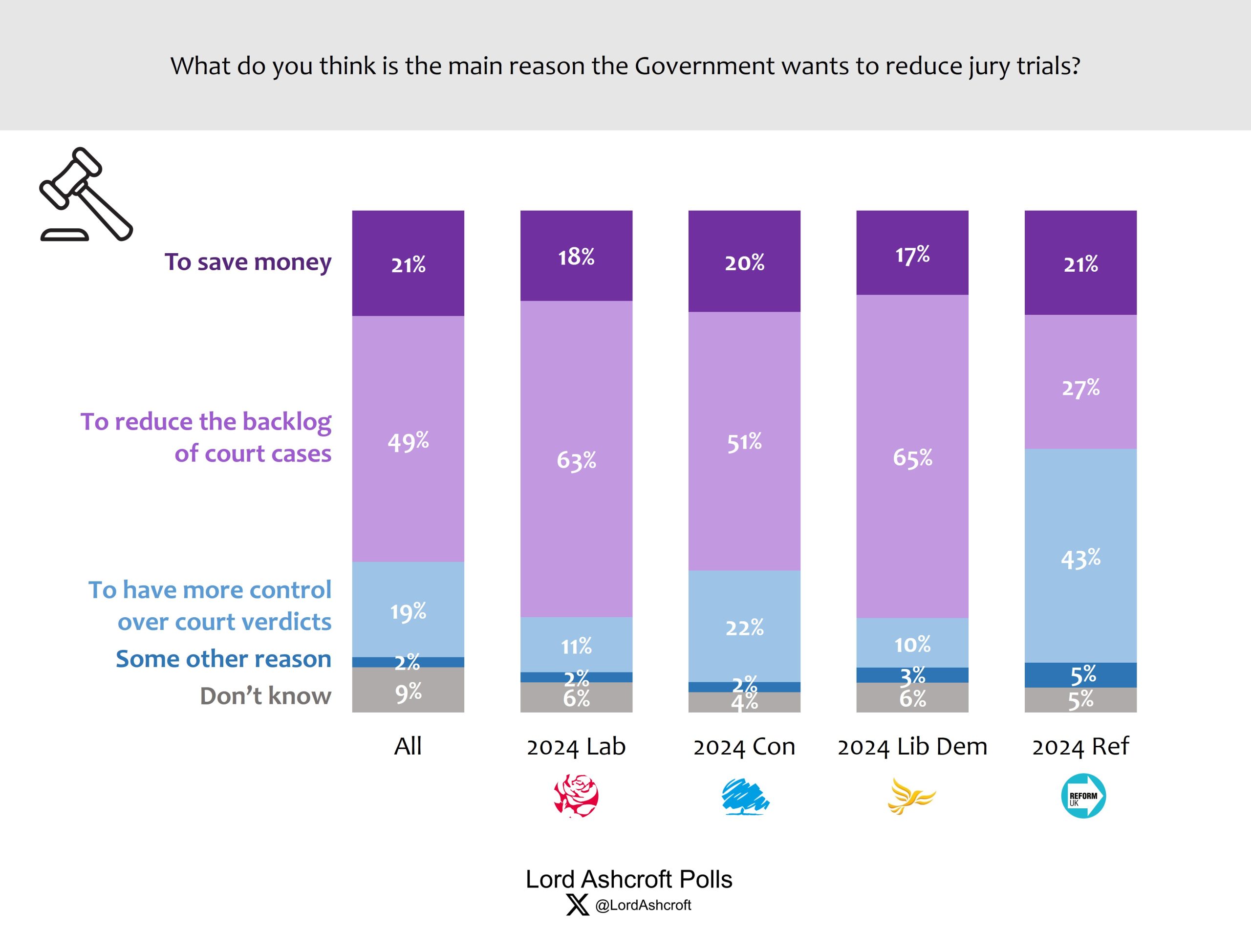 Just under half thought the government wanted to restrict the use of jury trials for its stated reason of reducing the backlog of court cases. Just over one fifth thought the aim was to save money, while almost as many thought the motive was to have more control over court verdicts. In a separate question, a clear majority, including majorities of all parties’ voters, said that if they were charged with a crime they would want the verdict to be decided by a jury. Fewer than one in five said they would rather the decision was made by a judge.